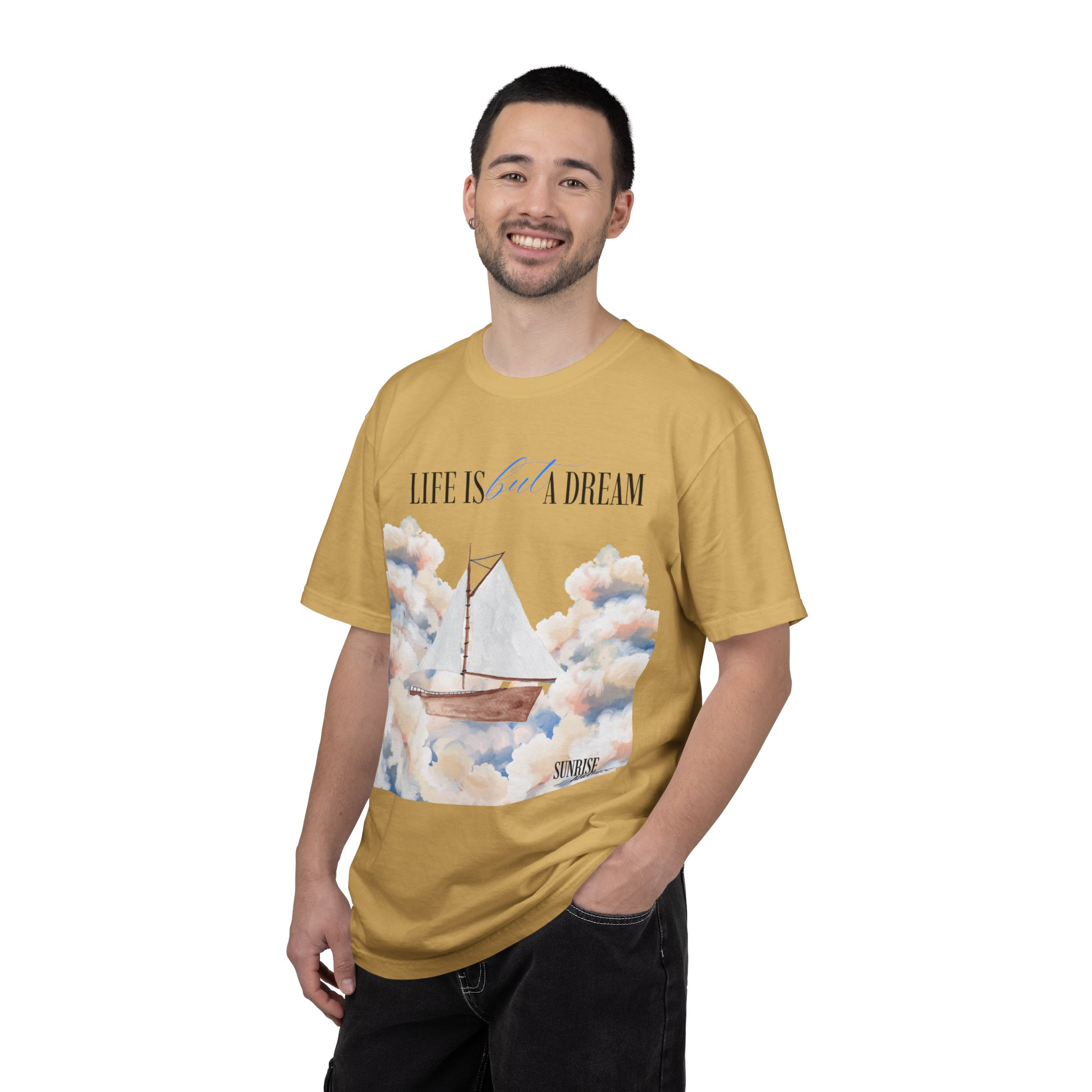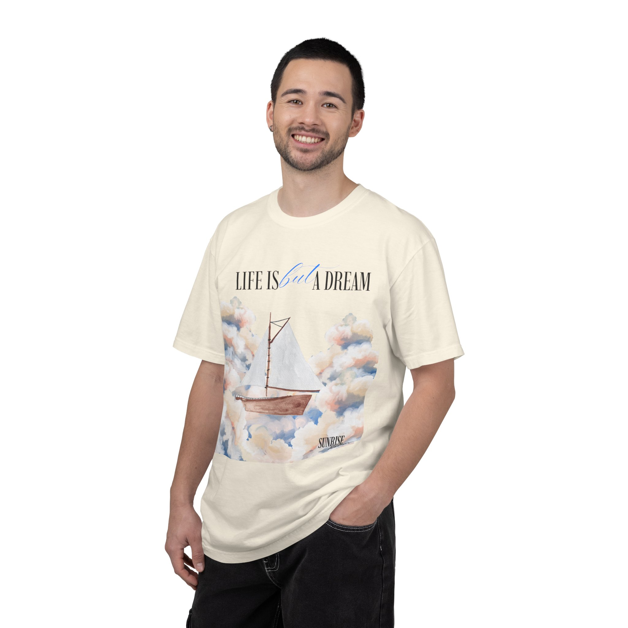 Salt-spray mornings and slow, sun-washed afternoons live in this shirt. A simple sailboat silhouette and the whisper of “Life is but a dream” sit against a warm sunrise-harvest palette — the kind of tee you reach for when you want calm, not noise. It wears softly from the first day thanks to garment-dyed cotton; the relaxed cut and heavyweight knit make it feel grounded while the tubular construction keeps the lines clean. Fold it into a beach bag for an early morning run to the pier, throw it on for a lakeside bonfire, or wear it while you trace the horizon from your favorite dock. For people who chase salt air and quiet horizons, this tee becomes one of those trusted pieces that holds the memory of a place.