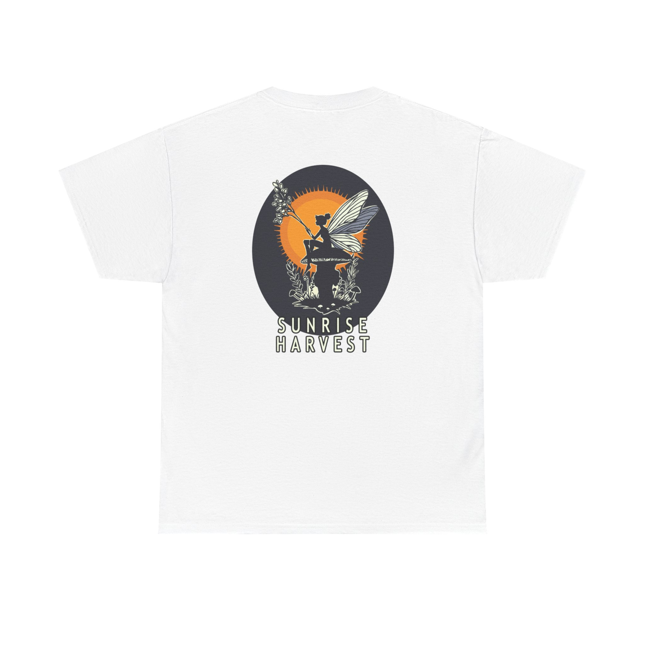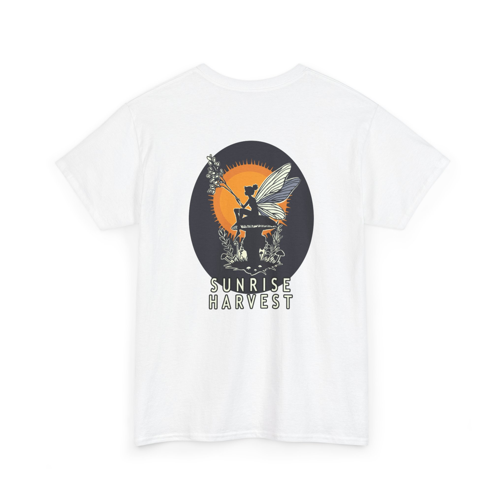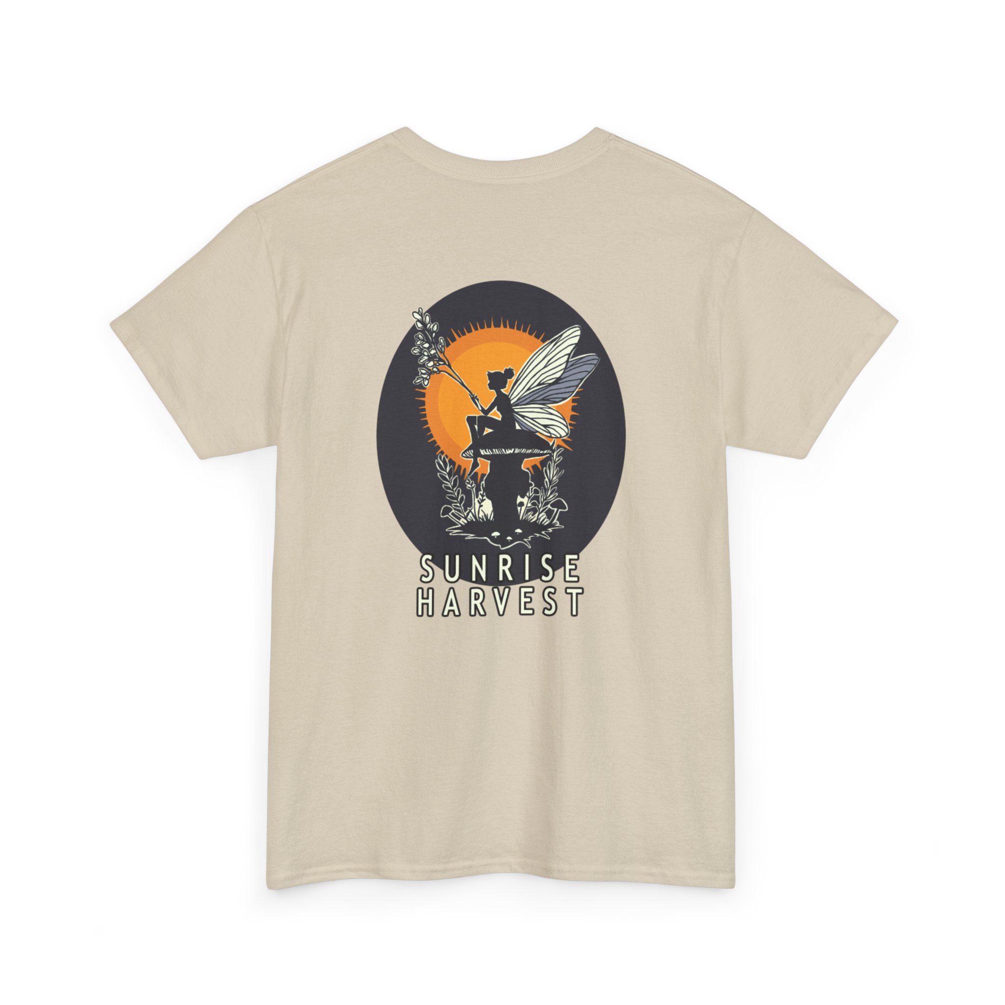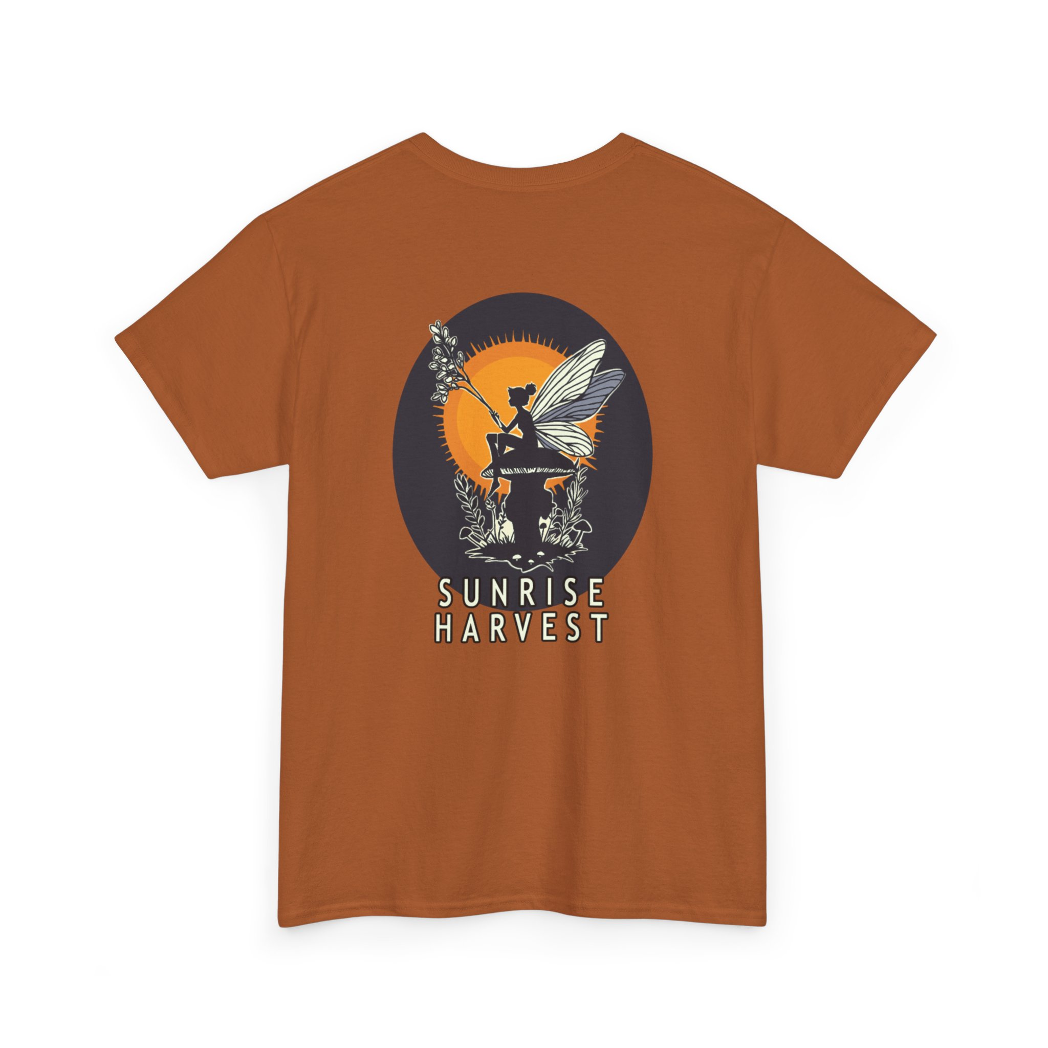 A soft, breathable cotton tee printed with a thoughtful sunrise-harvest illustration that sits low on the chest and larger on the back. The front shows a tidy wordmark and a small sun-and-flower vignette, while the back opens up into a moody, vintage-inspired scene: warm orange sun, delicate wings, and hand-drawn botanicals. It feels like a slow morning in a garden—mud under your boots, steam from a thermos, hands still warm from work. Wear it when you’re up before the town, heading to a market stall, or lounging with a cup of coffee as light spills across the porch. The classic crew and relaxed fit let the artwork be the focus, and the sturdy cotton holds up wash after wash without losing shape.