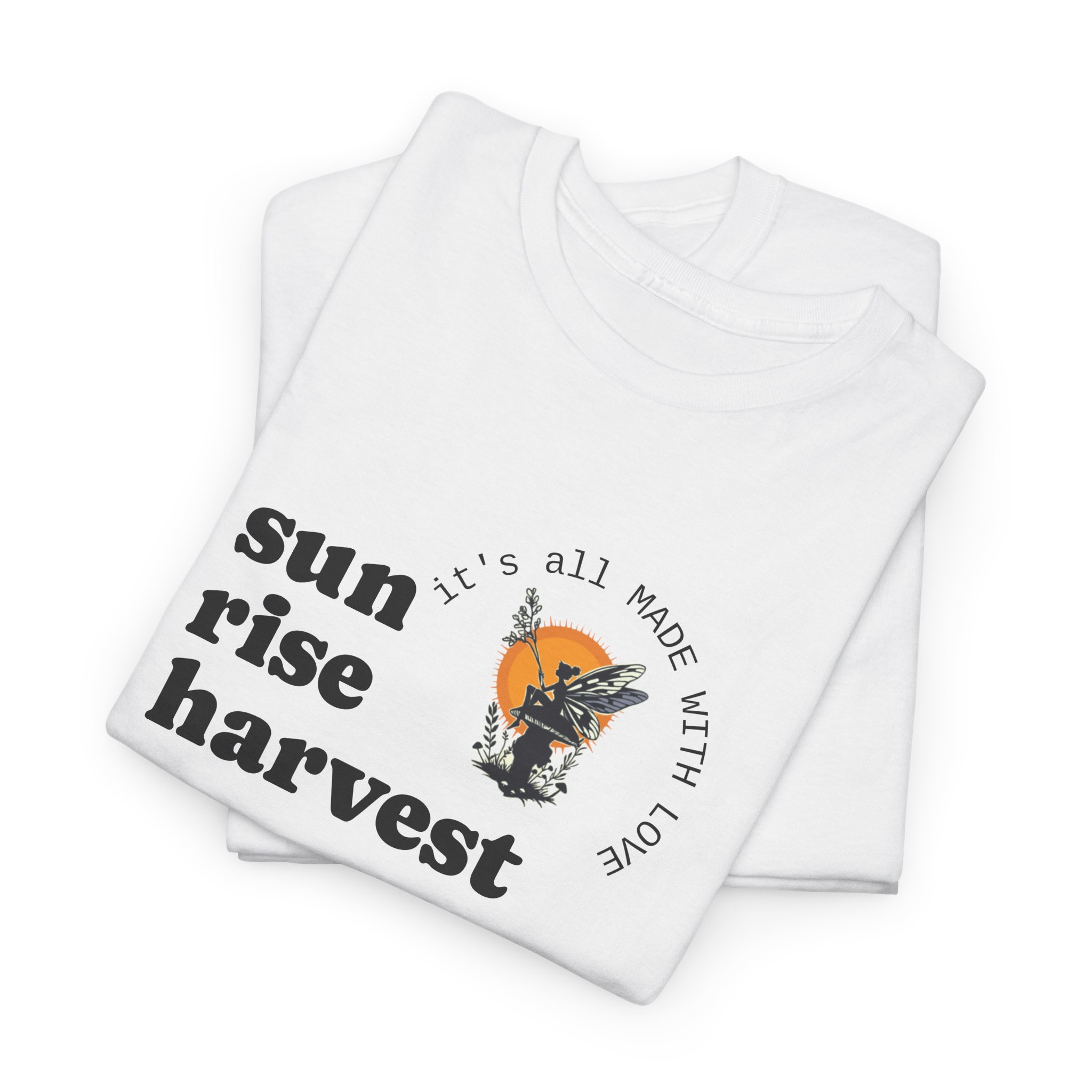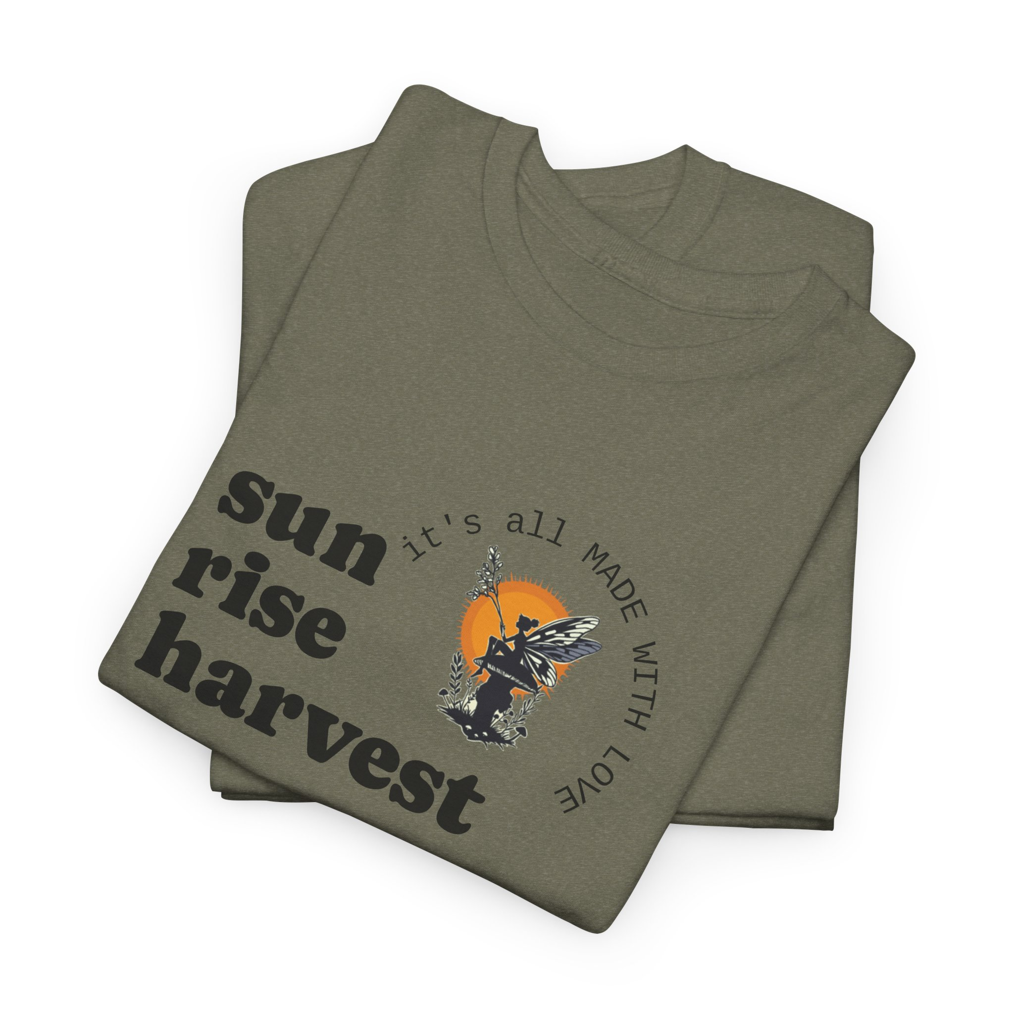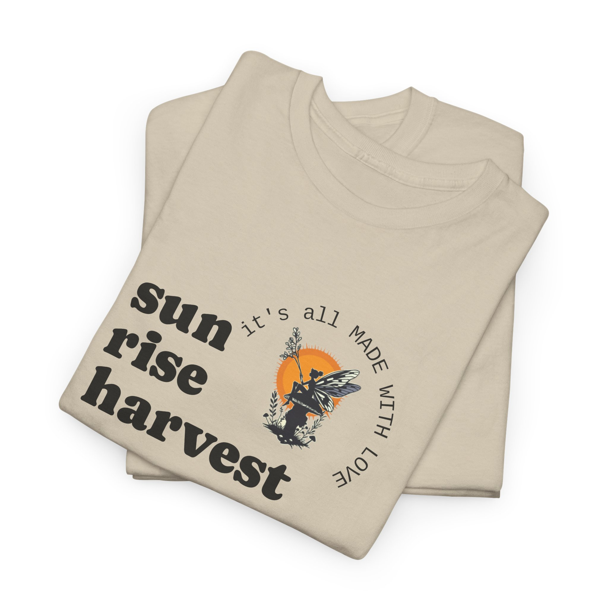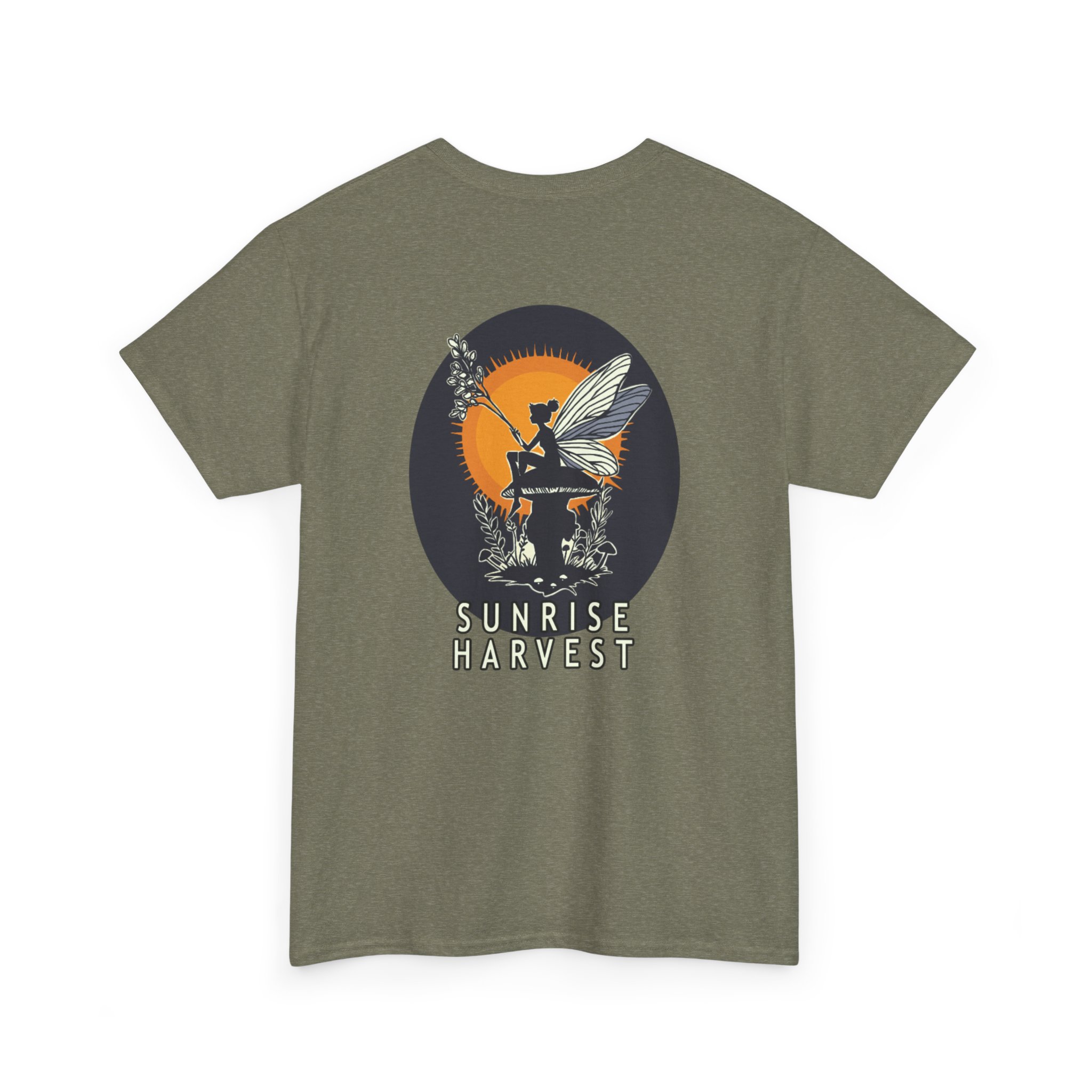 A soft, breathable cotton tee printed with a thoughtful sunrise-harvest illustration that sits low on the chest and larger on the back. The front shows a tidy wordmark and a small sun-and-flower vignette, while the back opens up into a moody, vintage-inspired scene: warm orange sun, delicate wings, and hand-drawn botanicals. It feels like a slow morning in a garden—mud under your boots, steam from a thermos, hands still warm from work. Wear it when you’re up before the town, heading to a market stall, or lounging with a cup of coffee as light spills across the porch. The classic crew and relaxed fit let the artwork be the focus, and the sturdy cotton holds up wash after wash without losing shape.
