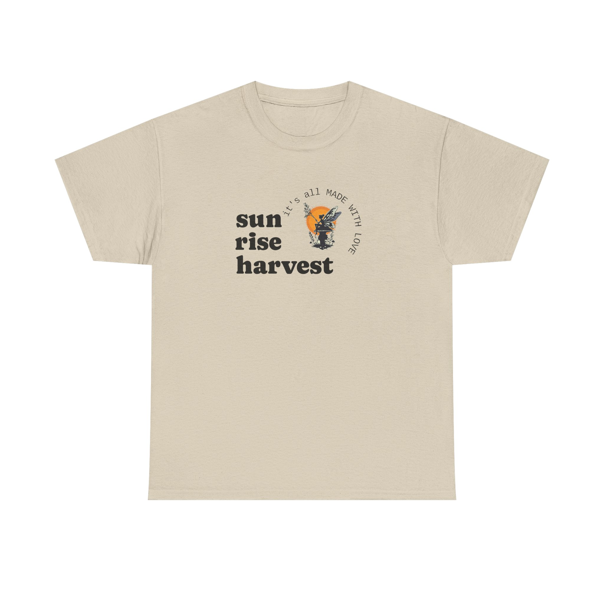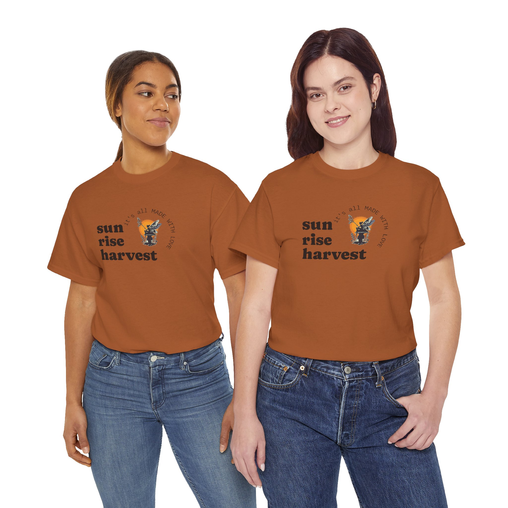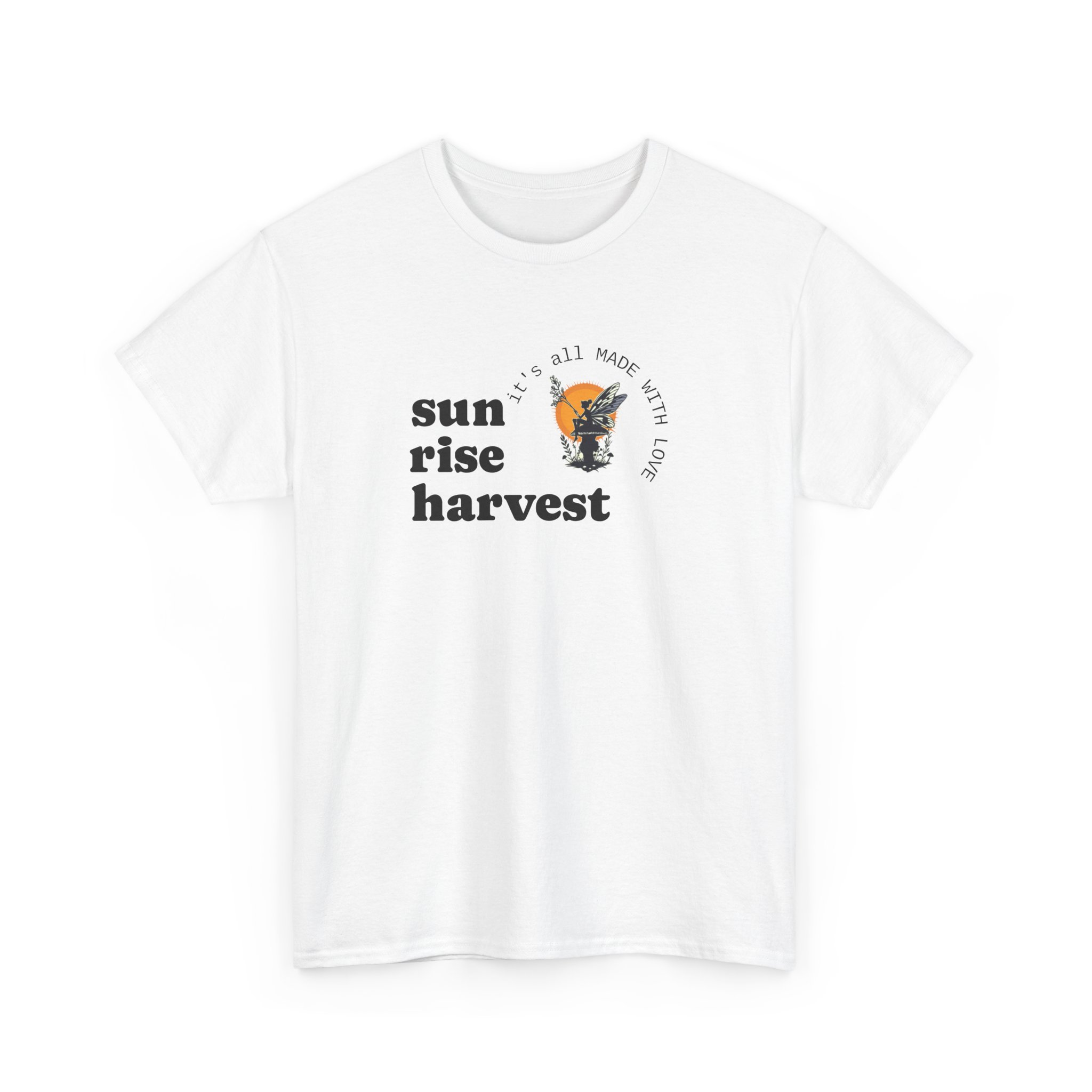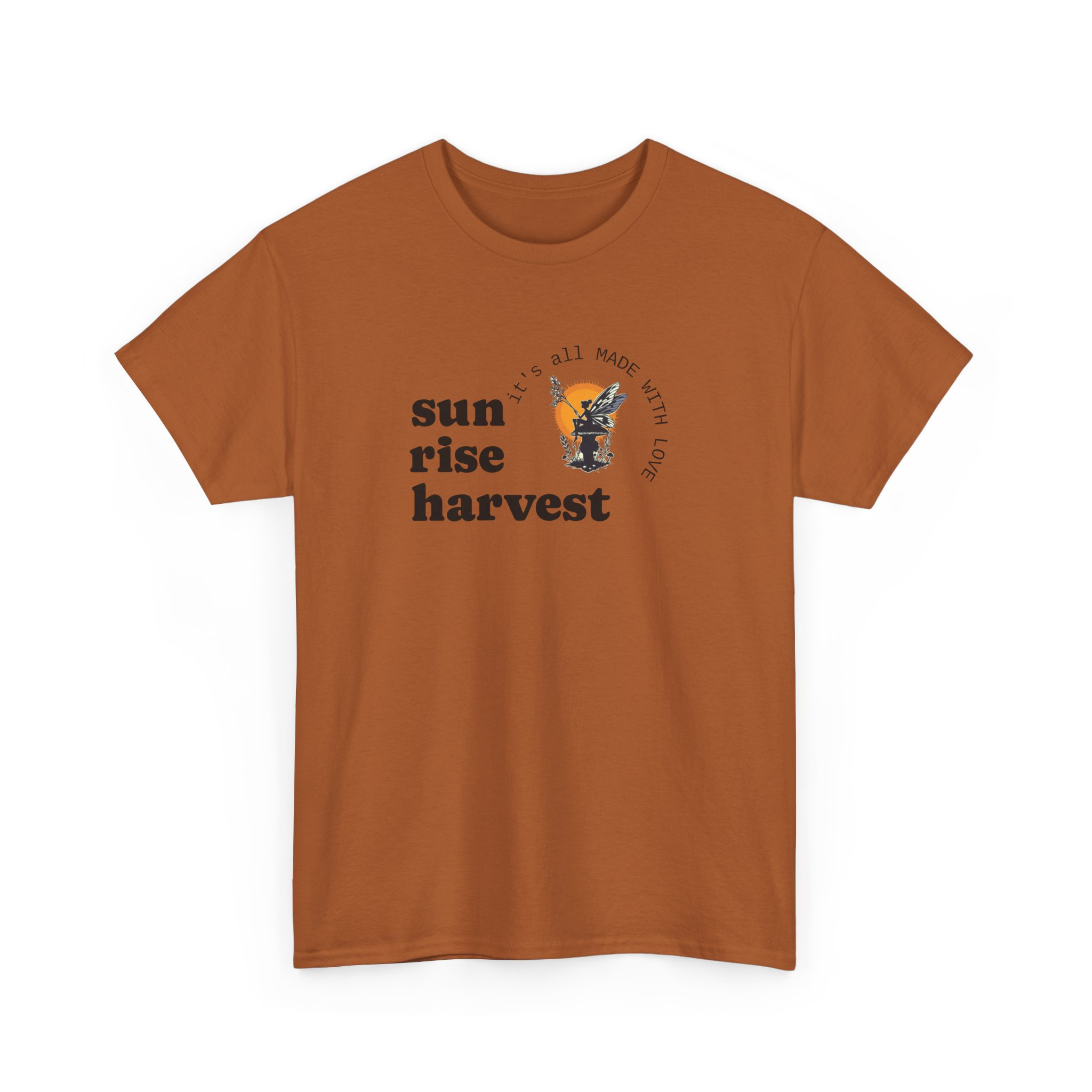 A soft, breathable cotton tee printed with a thoughtful sunrise-harvest illustration that sits low on the chest and larger on the back. The front shows a tidy wordmark and a small sun-and-flower vignette, while the back opens up into a moody, vintage-inspired scene: warm orange sun, delicate wings, and hand-drawn botanicals. It feels like a slow morning in a garden—mud under your boots, steam from a thermos, hands still warm from work. Wear it when you’re up before the town, heading to a market stall, or lounging with a cup of coffee as light spills across the porch. The classic crew and relaxed fit let the artwork be the focus, and the sturdy cotton holds up wash after wash without losing shape.