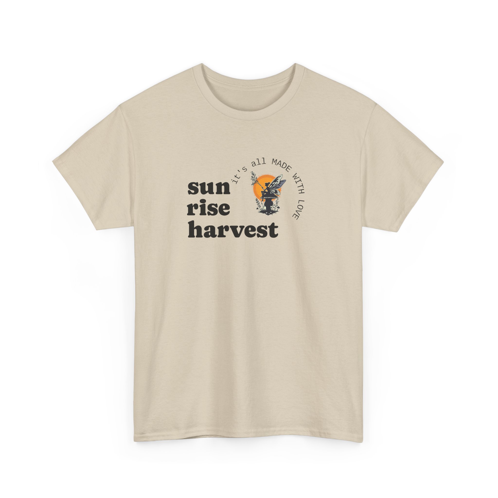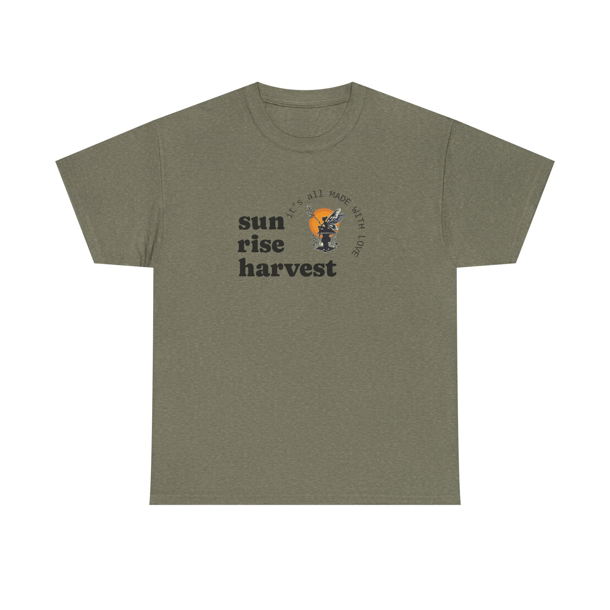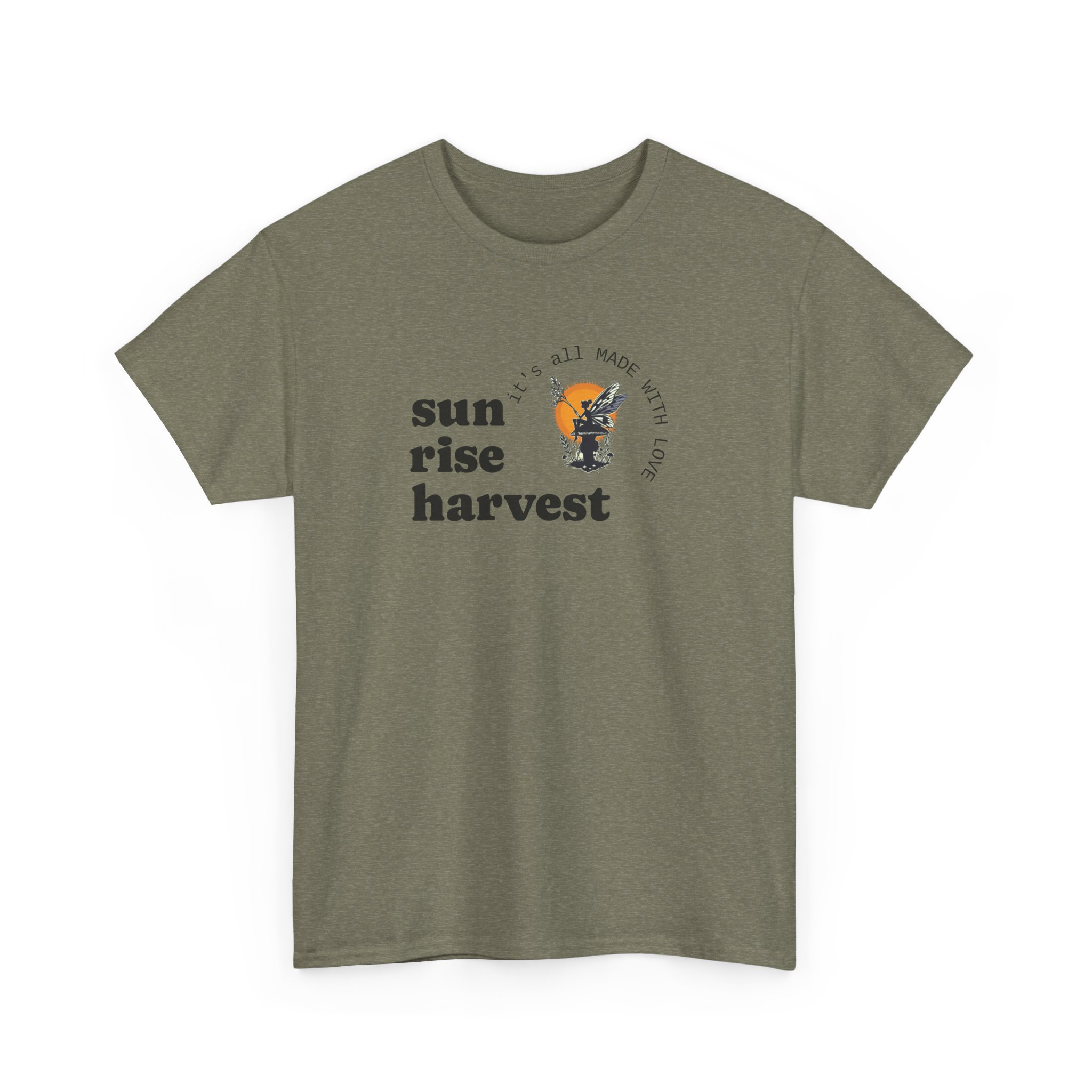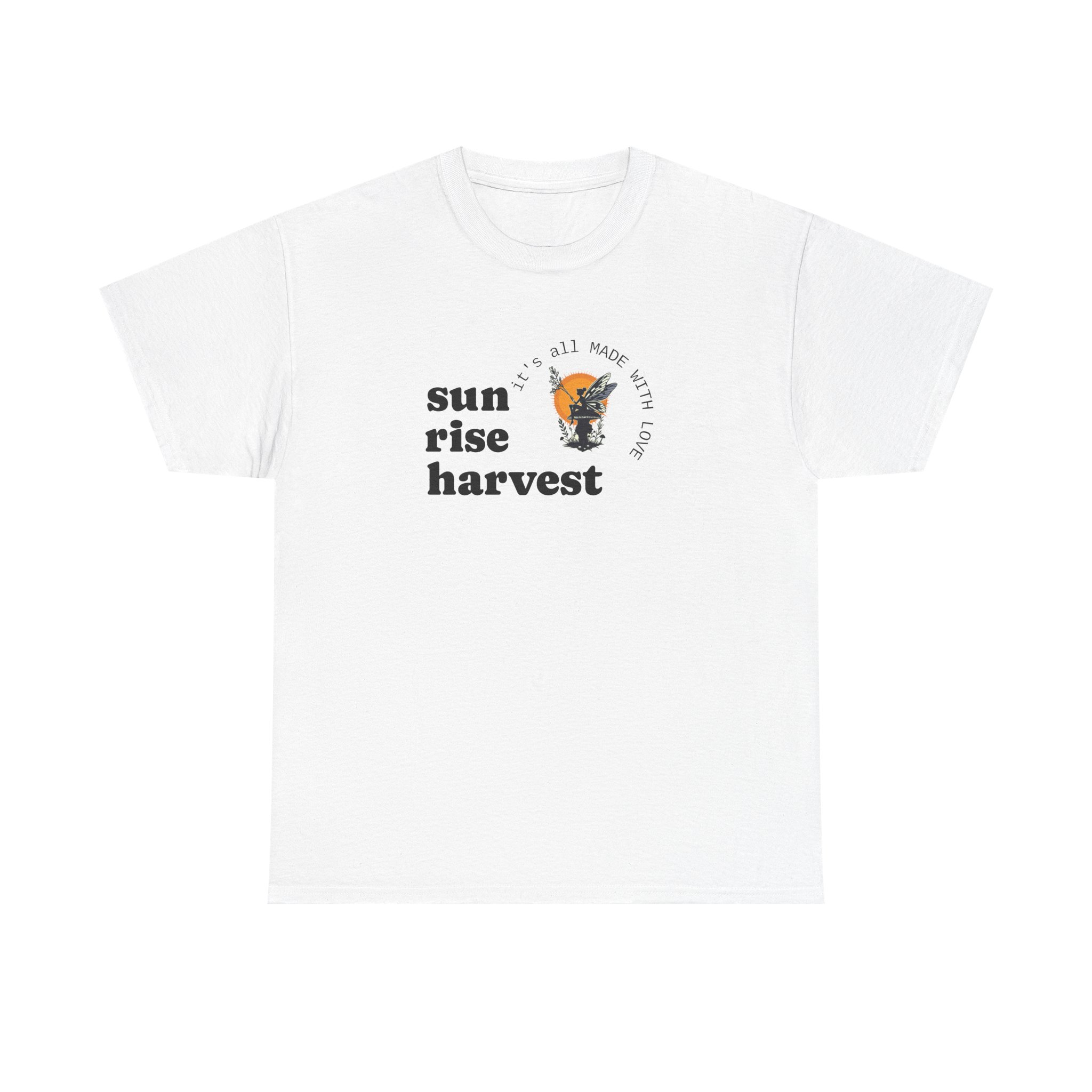 A soft, breathable cotton tee printed with a thoughtful sunrise-harvest illustration that sits low on the chest and larger on the back. The front shows a tidy wordmark and a small sun-and-flower vignette, while the back opens up into a moody, vintage-inspired scene: warm orange sun, delicate wings, and hand-drawn botanicals. It feels like a slow morning in a garden—mud under your boots, steam from a thermos, hands still warm from work. Wear it when you’re up before the town, heading to a market stall, or lounging with a cup of coffee as light spills across the porch. The classic crew and relaxed fit let the artwork be the focus, and the sturdy cotton holds up wash after wash without losing shape.